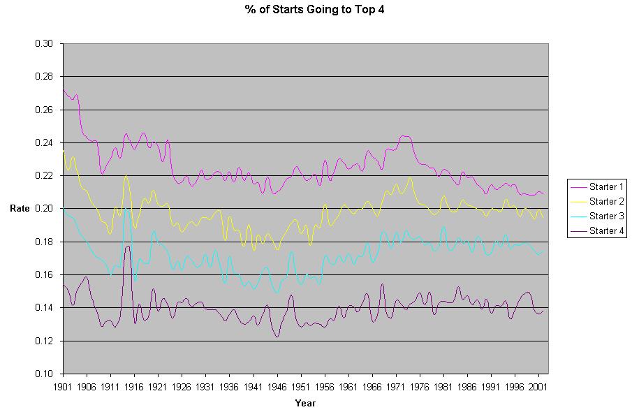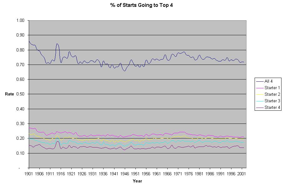 The peak post-1920 occurs in 1974, with a rate of 79%. If you had 5 full-time and healthy starters, you'd expect 4 of them to get 80% of the starts. The median from 1901 to 2002 is 73%. In the last 5 years, the average was 72%.
